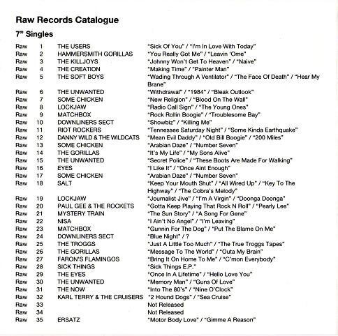 1977年創設英国のインディペンデント・レーベル"RAW RECORDS"がリリースしてきた名作7インチEPの数々を集約したシングルコレクション。