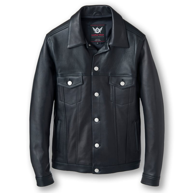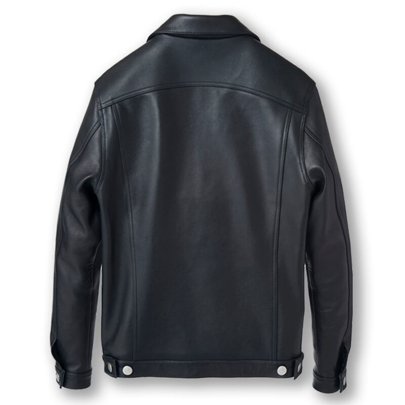 シャープに大人の雰囲気を演出する為に、胸ポケットフラップを敢えて一回り小さくし、裾一周のベルト、袖口カフス、腰ポケット玉縁等も通常よりかなり細幅にし、ロックなレザージーンジャケットとして、スリムフィットに仕上げています。
